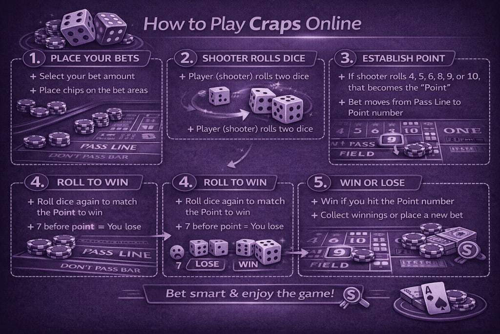 Learning how to play craps is easier than the table layout suggests. At its core, you are betting on the outcome of two dice. The game revolves around one key roll — whether the shooter hits their “point” number before rolling a seven. Most of the complexity comes from the dozens of side bets available, but you only need three to play well. This guide covers the rules, every major bet type with its house edge, which wagers to avoid, and practical tips for playing online.